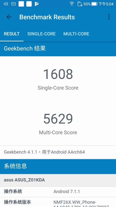 GeekBench 4 的部份,單核心獲得 1608 分,多核心獲得 5629 分。