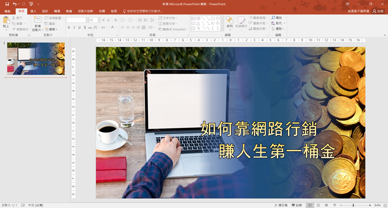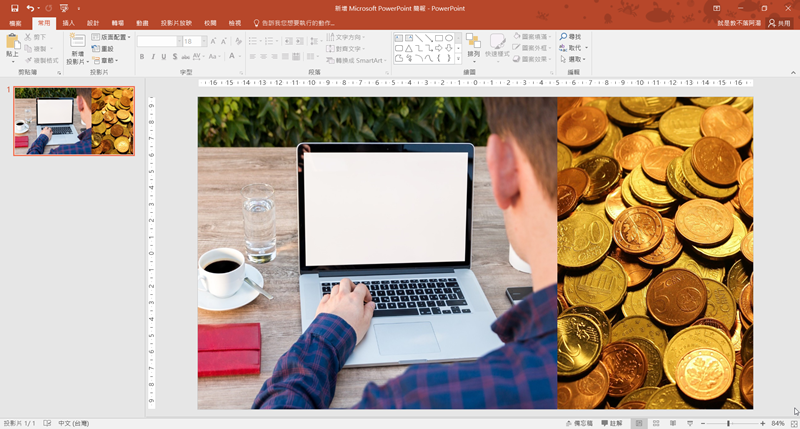開啟 PPT 後新增一張空白投影片,並確認版面設置為 16:9。