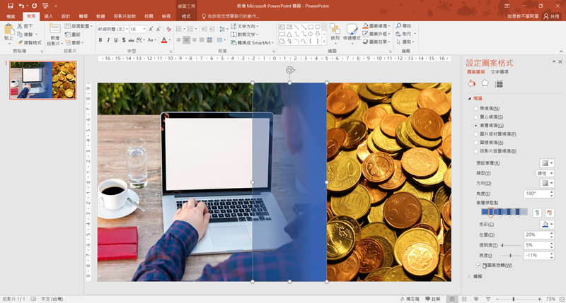 然後改成自己喜歡的顏色,以「線性漸層」填滿,並增加多個漸層停駐點,調整位置與透明度,色彩透明度隨停駐點的數字增加。