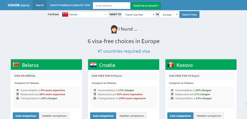 結果歐洲只有六個國家可免簽,其他 47 國都需要簽證,除了顯示簽證方式與期限還有住宿、餐廳、交通跟台灣的比較,高或低多少%,很值得參考。