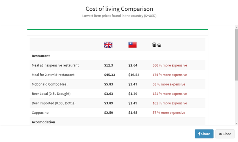 點進去是關於生活成本的詳細資訊,像阿湯想去的英國在怎樣的餐廳、不同的住宿條件、使用不同的交通工具等等,與在台灣的消費差距都有列出,同樣是麥當勞組合餐在台灣最低可花 3.47 美元,但在英國要 5.83 美元,貴了 68 %。
