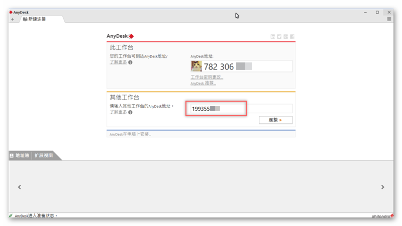 免安裝直接點開啟就是這個畫面,上面是你的地址,將要連線的電腦地址輸入在下方,點連接。