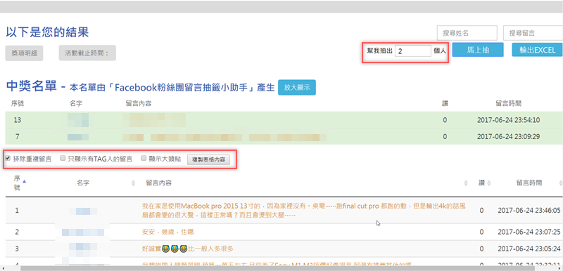 結果出來後每一項會有序號、帳號名、留言內容與時間,並可選擇是否排除重複留言。