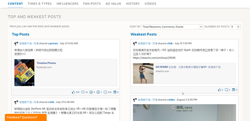 往下看還有反應最好與最弱的貼文,顯示幾則與時間段都可以設定。