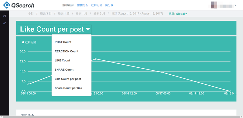 折線圖除了全部貼文當然也能切換成按讚或分享來檢視,時段也可自由調整。