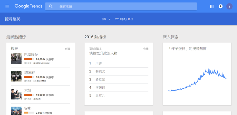 接下來是跟關鍵字與熱門話題相關的網站,第一個就在萬能的 Google 大神旗下,首頁可觀察最新熱搜榜與討論熱度。