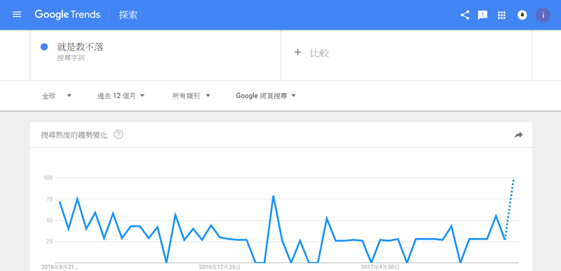 輸入「就是教不落」搜尋,預設是一年來的搜尋趨勢,沒想到起伏還蠻大的,阿湯要好好研究才行。