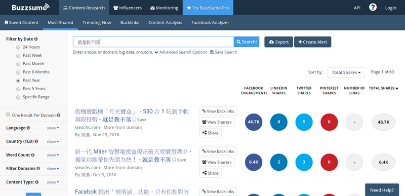 同樣輸入「就是教不落」這裡搜尋出來的比較詳細,可看到文章內容、分享者、與連結數量等等,不過像查看反向鏈結等進階功能就需要註冊。