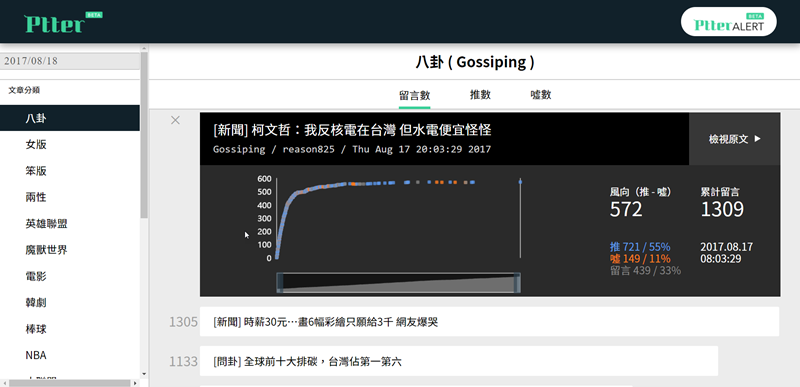最後就是純 PPT 網站分析了,選擇哪個版之後可依留言數、推數、噓數排序,點標題即可查看指標內容與言論「風向」,或檢視原文來參考。