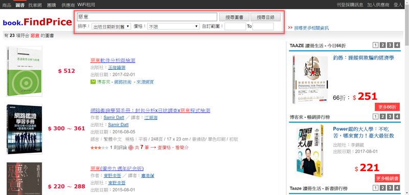 像這案例因為書名太簡易就搜出 23 筆,並在書名後顯示價格範圍,可在頂端進階設定與排序。