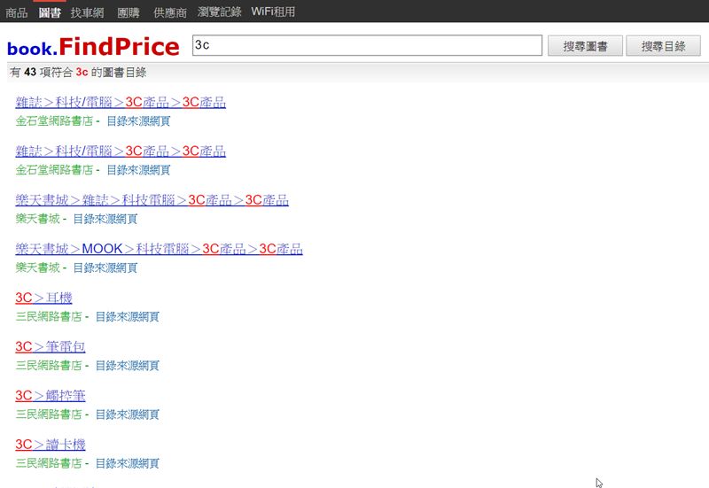 如果想查比較大的類別,也可用「圖書目錄」來搜尋,看看哪些地方可買到這類的書。