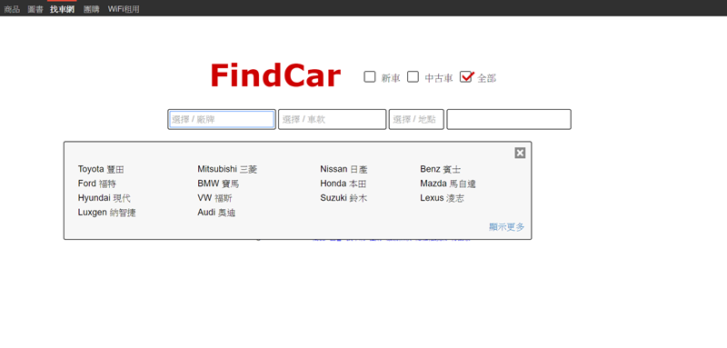 除了找書,左上方還有商品、車、團購、Wi-Fi 的線上工具可利用,例如想找哪個牌子的車、車款、車行地點,也可以快速搜尋比價。