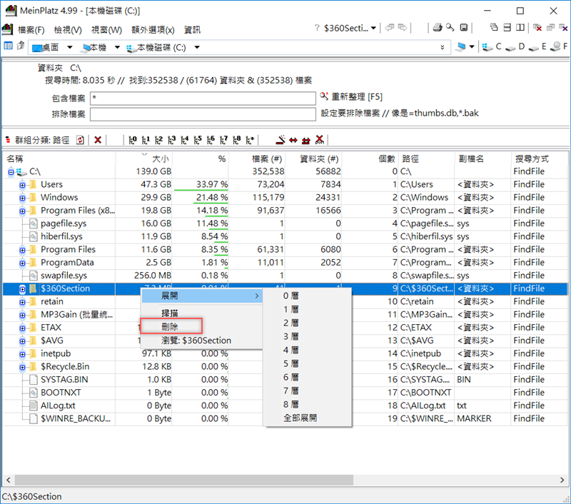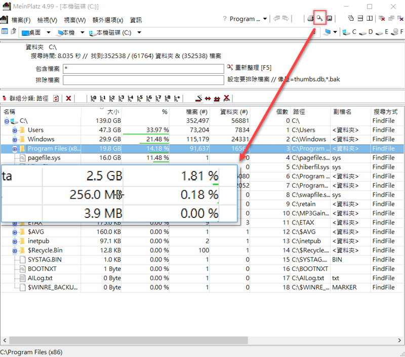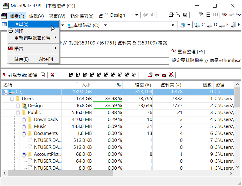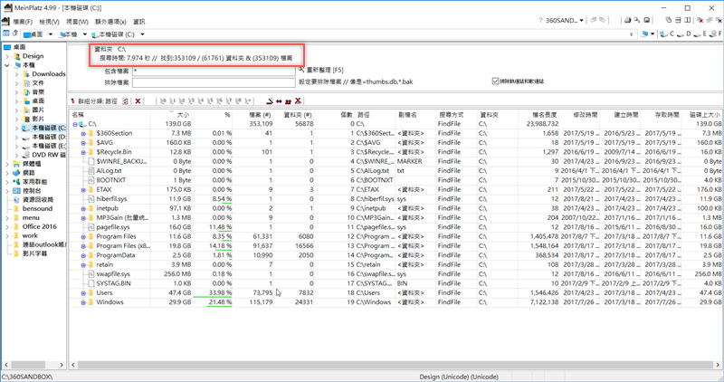 速度很快,阿湯掃了 C 槽 3 萬多個檔案才花了不到 8 秒,從下面檢視成果,檔案名稱、大小、佔多少%、路徑、修改時間與建立時間等資料都相當清楚。