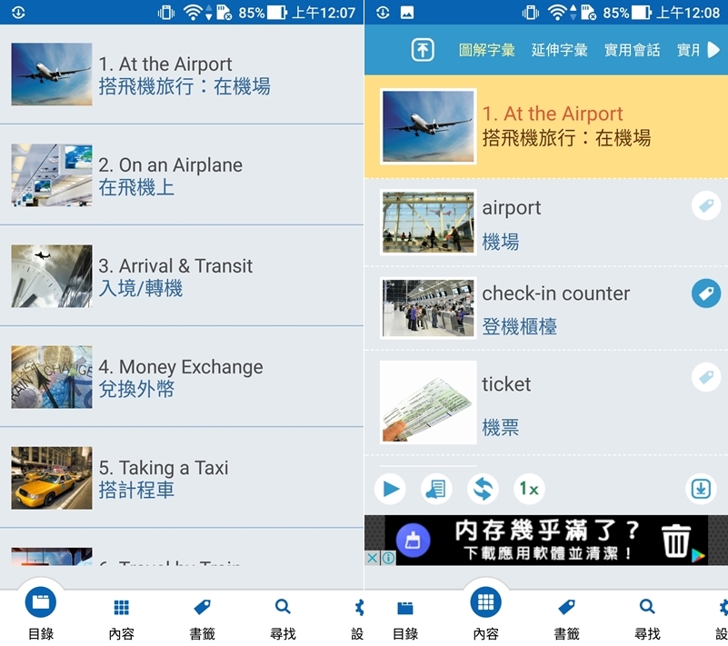 首頁目錄共有 23 項,由虛擬出國的過程排序,包括在機場、兌外幣、租車、問路、加油、住宿、購物等等,點第一項「在機場」進來看看,先是字彙。