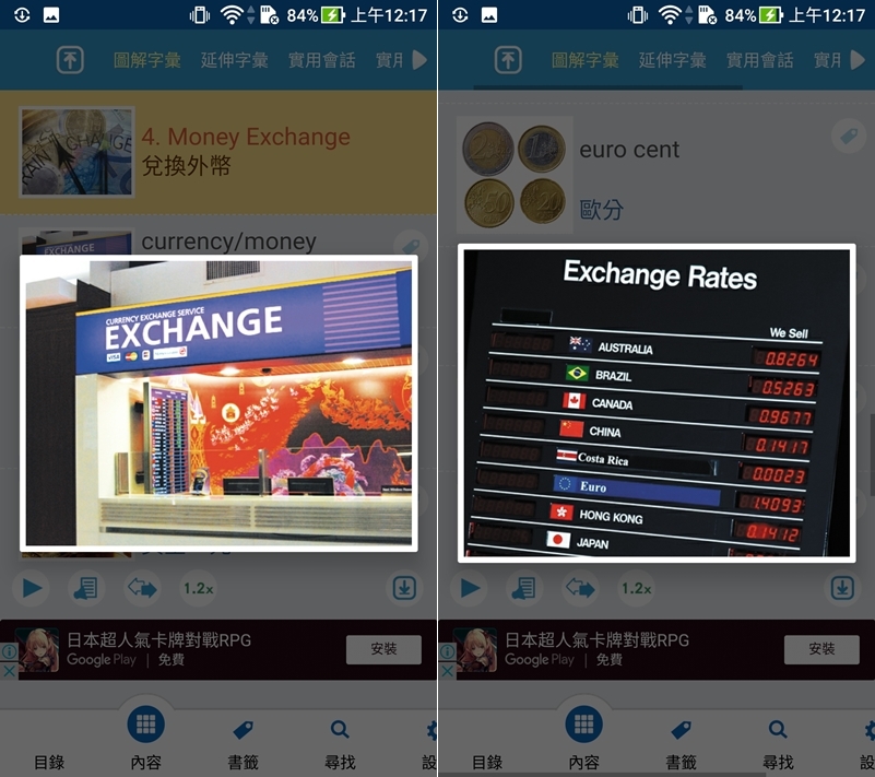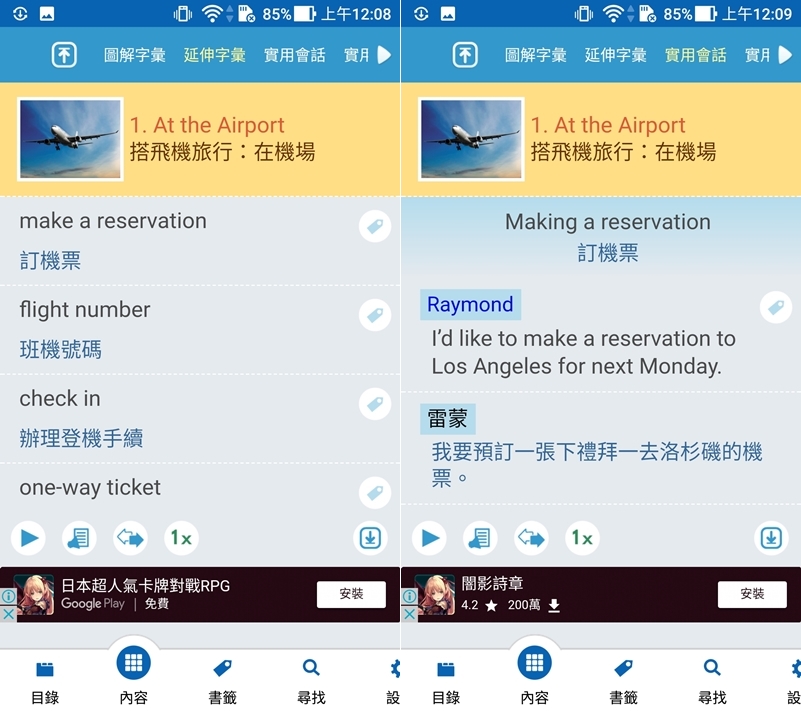 然後是延伸字彙和實用會話,點擊開始播放,可從下排功能列調整語速、循環等,也可點右排書籤圖示收藏需要的內容。