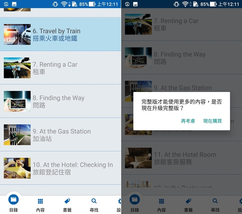 但免費使用只有到第六項「搭乘火車或地鐵」,第七項之後就要付費升級了,大家可先試用再視需求而定。