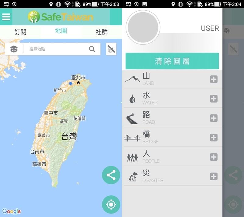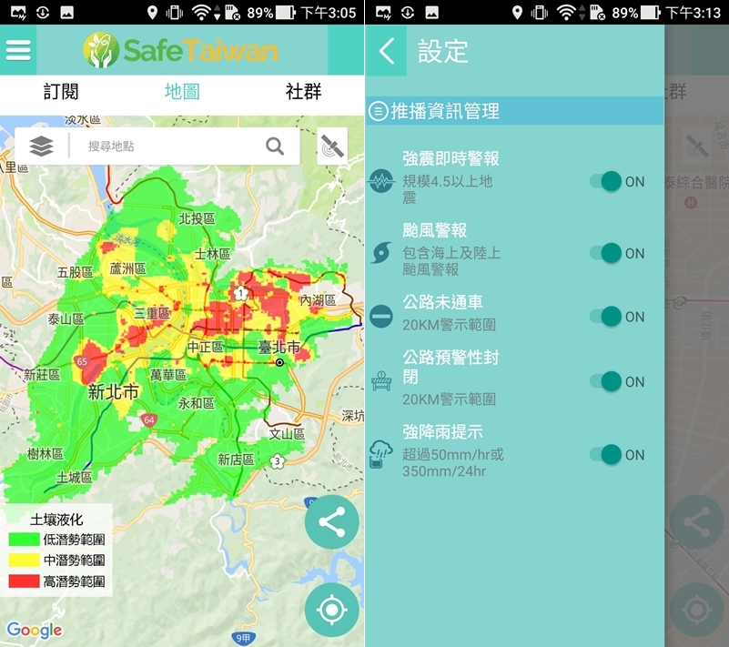 例如土壤液化,選擇後就會以圖層方式覆蓋在地圖上,可清楚辨識哪裡是危險區,還有推播設定,包含強震、颱風、公路未通車、公路封閉與強降雨提示。