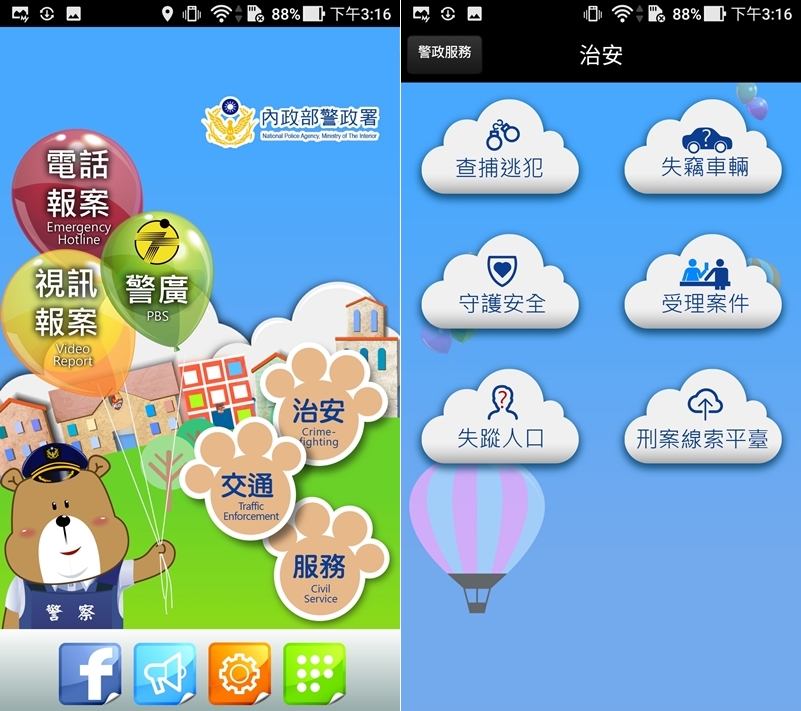 點連結,分治安、交通、服務三大項,像治安部分可查詢失蹤人口、失竊車輛、受理案件紀錄等。