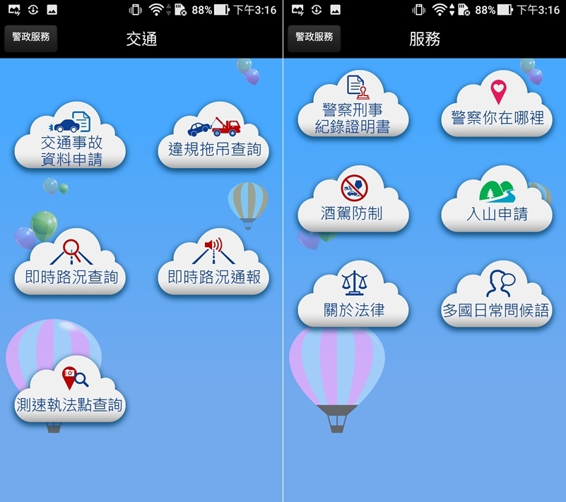 交通方面可查詢違規紀錄與路況,良民證、入山證申請、酒駕防制等等則在服務頁面,點進去即可使用,有需求可以用用看。