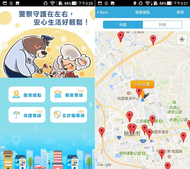 這是警政服務的延伸 APP,用途在快速搜尋最近的警力,也可點專線自動播打通話。