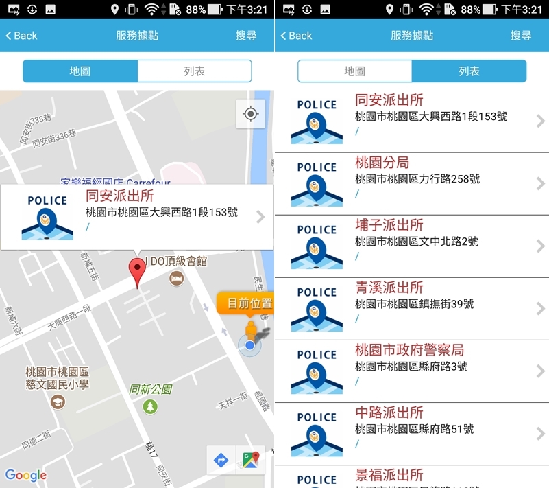 除了以鄰近地圖顯示也有清單可查詢,點列表進去有詳細的地址與電話,頁面好操作,應該比在網頁上找要快許多。