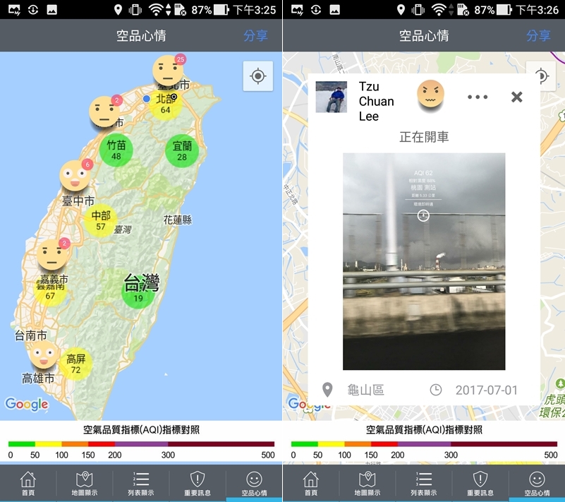 比較有趣的是民眾還可以反映空氣品質造成的心情影響,像附近的煉油廠廢氣就讓人不太舒服。