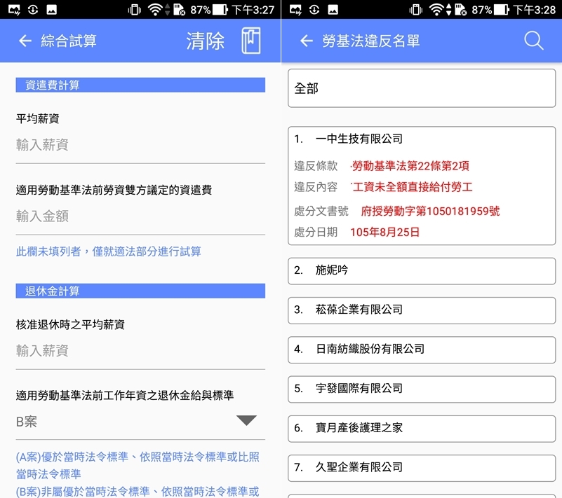 加班費、資遣費、退休金試算都不錯用,也可進入違法名單看看有那些慣老闆,求職前一定要查個清楚。