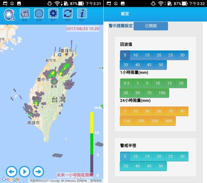 或是切換成最近雨量分布、雨區的觀測狀況,也可視需求設警示提醒,回波值、警戒半徑,1 小時及 24 小時雨量達到多少需提醒都能設定。