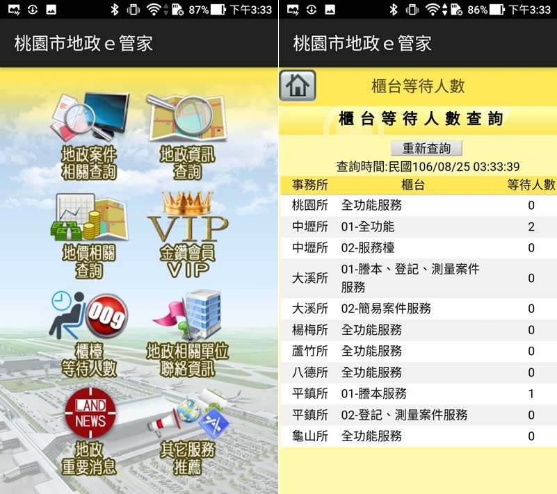 接下來是關於地政的服務,雖然介紹桃園的但其他縣市都有 APP,除了有地價、地政的相關資訊,還可查看即時櫃台等候人數,蠻方便的。