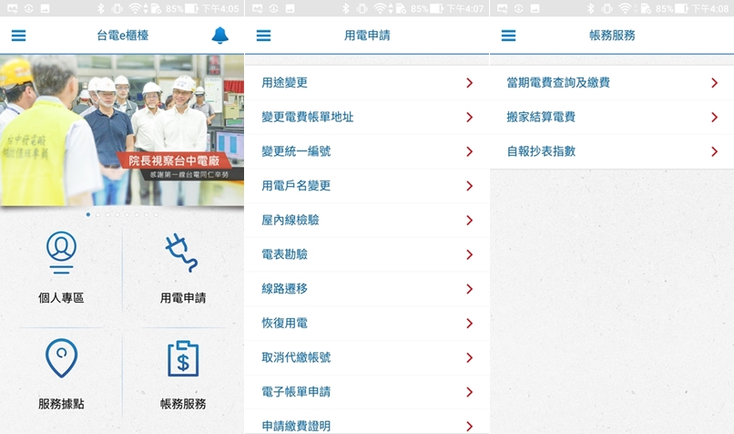 上次 815 停電鬧得人心惶惶,那時這款 APP 也當掉了,不然平時用來查資訊還不錯,還有電費試算、查詢、變更用戶等功能,可惜操作起來不太順,有的功能也無法即時顯示。