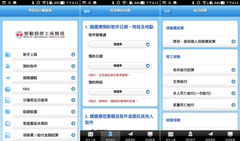 勞保局推的這款拿來申請各項資料還不錯,預約好就不用一直等,還提供保費試算、分級表查看等功能,麻煩的是要用自然人憑證註冊,沒有的話就不能用。