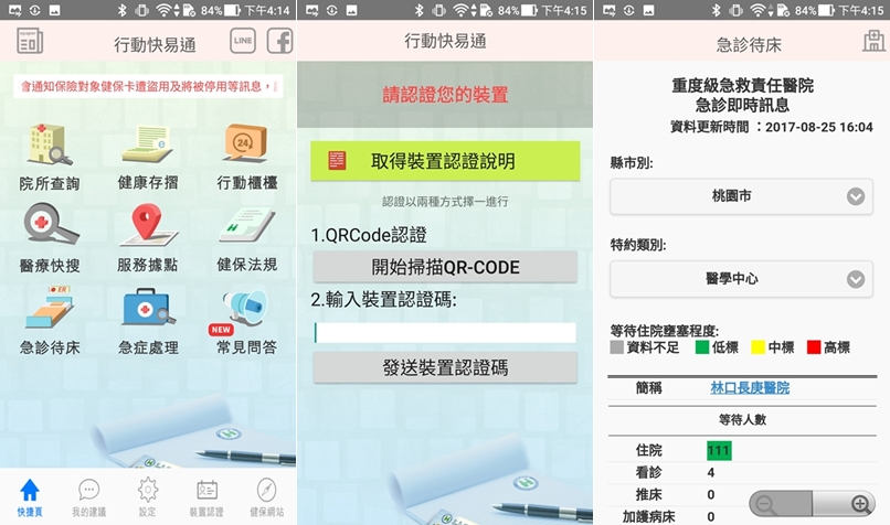 註冊要用讀卡機並掃 QR Code 或輸入認證碼,雖然較能確保個資不外露,但一般人不太會用,不過查急診待床的功能不用認證即可查詢還不錯。