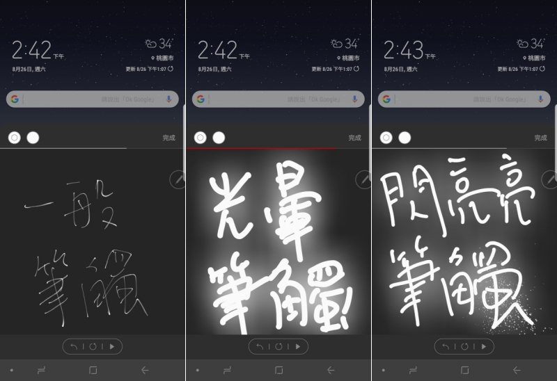 筆觸的三種樣式分別是一般(無任何效果)、光暈以及會有閃亮效果的筆觸,如同下方圖片呈現。