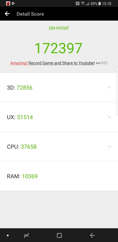 安兔兔的部份獲得 172397 分,這樣的分數不愧是當前最強的旗艦機種該有的等級啊。