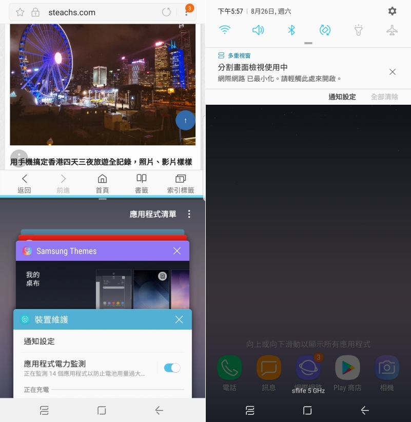 也因為這樣的特性,當你離開多重視窗回到桌面時,執行其他 APP 時,畫面會自動執行在多重視窗的下方那一區,除非你關閉多重視窗功能,否則不論你執行什麼 APP,都會保持著多重視窗的畫面,更加的方便。