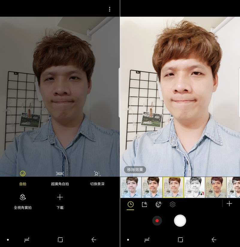 前鏡頭的操作介面同樣是上下左右,往左是功能選擇,包括很好用的超廣角自拍、景深模式以及全視角,往右同樣有很多濾鏡可以即時套用拍攝,對於自拍有大加分的效果。