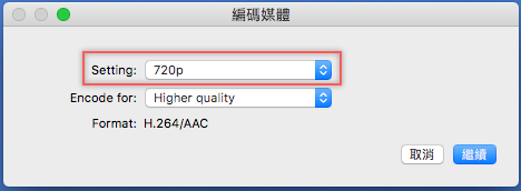 在「Setting」選擇「720p」,調整畫質後按繼續。