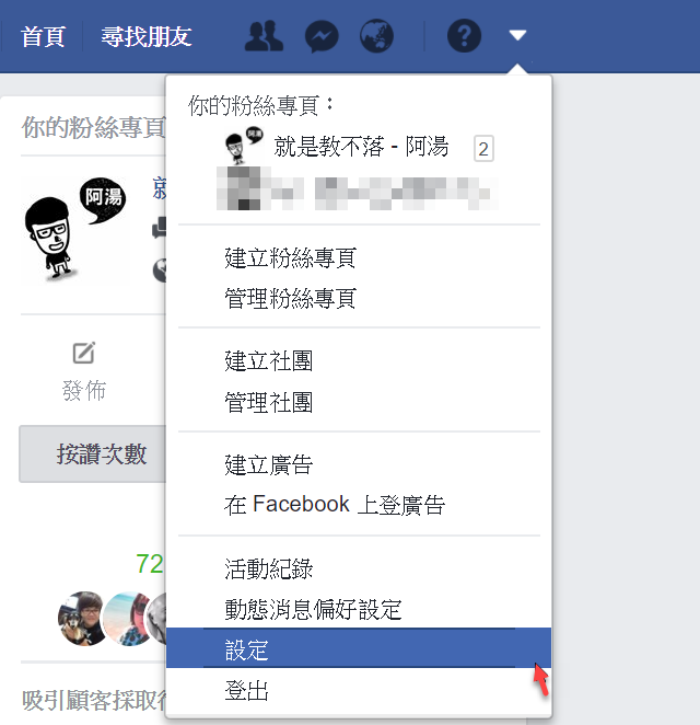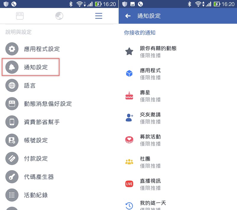 手機版能調整的地方比較少,先點開右上角清單圖示找到通知設定,再一一點進去更改。