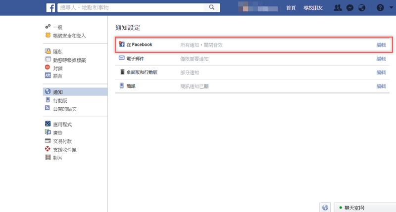 在左邊設定列表中找到通知,看到第一項「在 Facebook」最右邊的「編輯」。