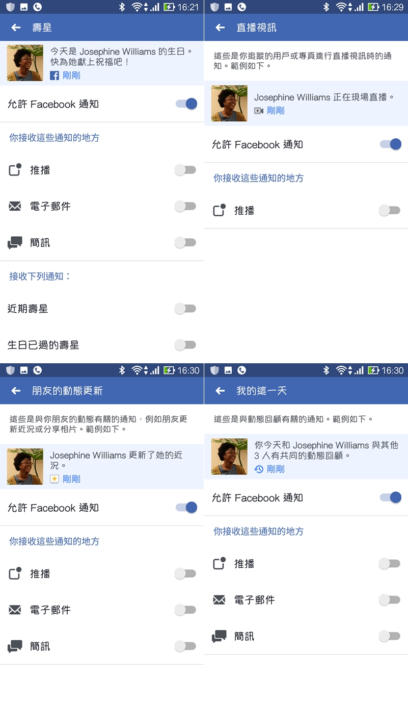 一般來說除了推播還會有電子郵件和訊息,你可以通通關閉,但如果連第一項「允許 Facebook 通知」都關掉的話,就完全都不會收到了,不過網頁版就算關掉生日通知,還是會顯示在首頁右邊,只能希望將來改版可以調整這點…