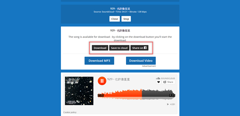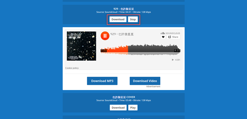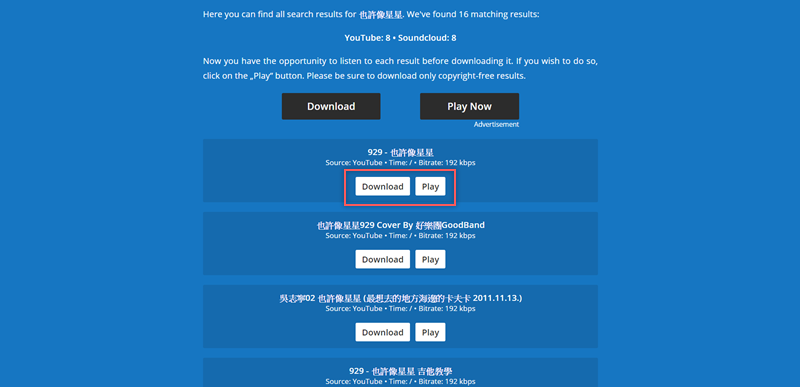 建議先預覽聽聽看 OK 再下載,要注意的是播放與下載的按鈕要點紅框裡面的那個,下面比較大塊的圖示只是廣告。