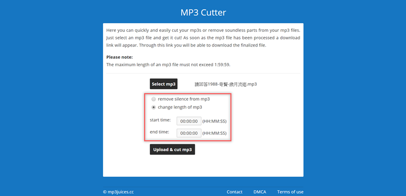剪輯的部分先上傳檔案後,再選擇要去除無聲音的段落,或輸入音樂開始與結束的時間來切割,沒辦法直接拉音軌來檢視比較麻煩一點。