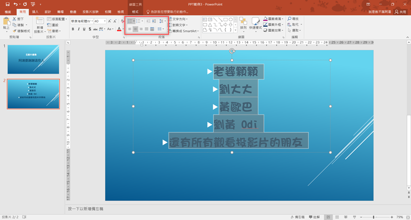 先將要放的文字編輯好後,全選、置中,再試需求看要不要將項目符號去掉。