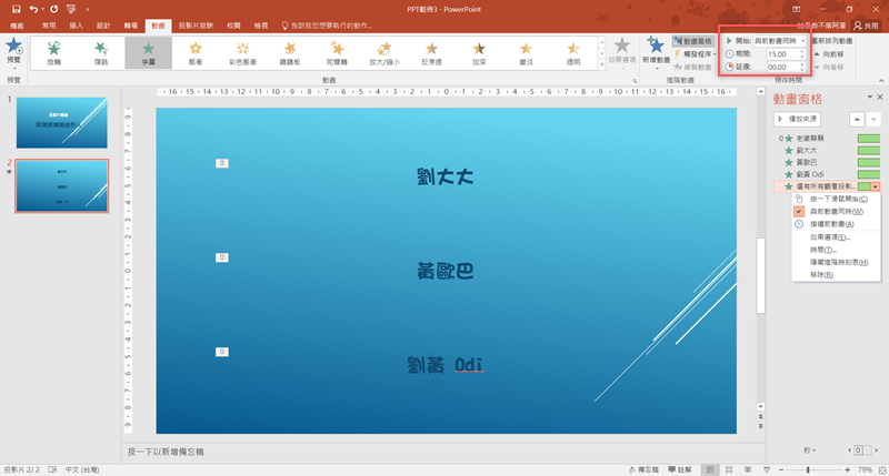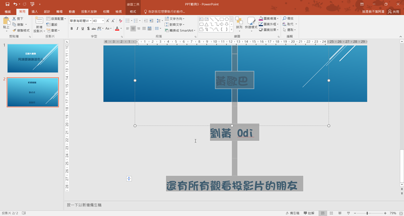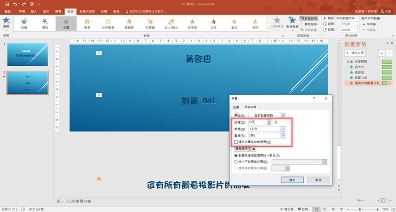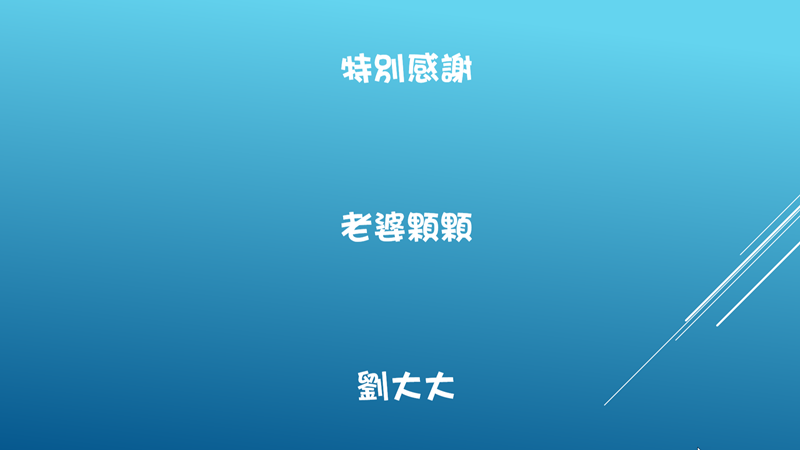 現在 PowerPonit 高手如林,聽說有的提案現場都在比誰做的簡報檔最有特色(比提案內容更引人注目…),不知道大家在簡報的最後一張都放什麼呢?無論多精彩的簡報,看到最後也是會累的,除了放上一張謝謝觀賞之類的句子,也可以利用動畫效果,列出工作團隊或是要感謝哪些人,再讓這些文字一行行往上跑,就像很多影片結尾那樣,一定會讓觀眾的印象更為深刻,搭配音樂效果更佳。