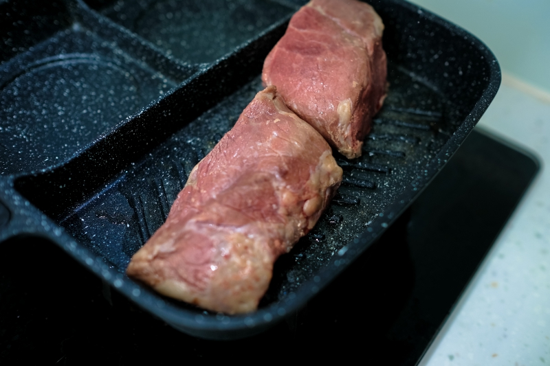 以阿湯的溫度來說,製作出整個牛肉五分熟的外觀,這時只要將外觀的水份都用紙巾吸一下就可以用鍋煎一下外表就可以了。