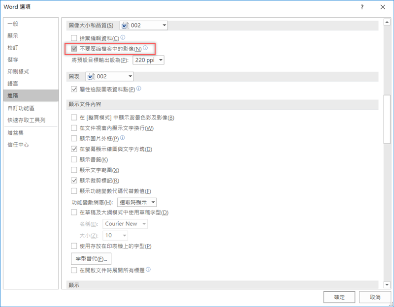 這項功能的優點是你壓縮後要還原也很容易,如果你的需求是文件中必須用原始的圖檔,就到 Word 選項 → 進階 → 圖像大小與品質下面,勾選「不要壓縮檔案中的影像」,還能調整預設的輸出尺寸。