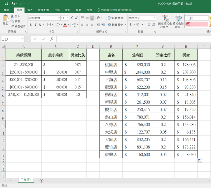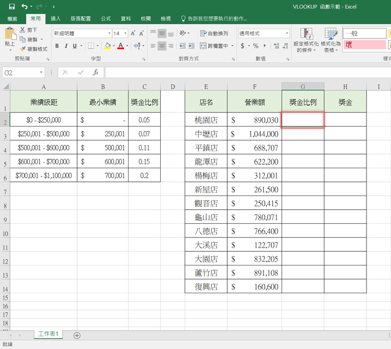 假設今天要示範業績獎金的發放比例,需要兩個表單,一個是業績的數字範圍可以抽多少%數,這種「對照」用的表格,另一個就是做了多少業績、所以獎金是多少%、最後可以得到多少金額這種「呈現結果」的表格,如下圖,我們先來看「獎金比例」這一格。