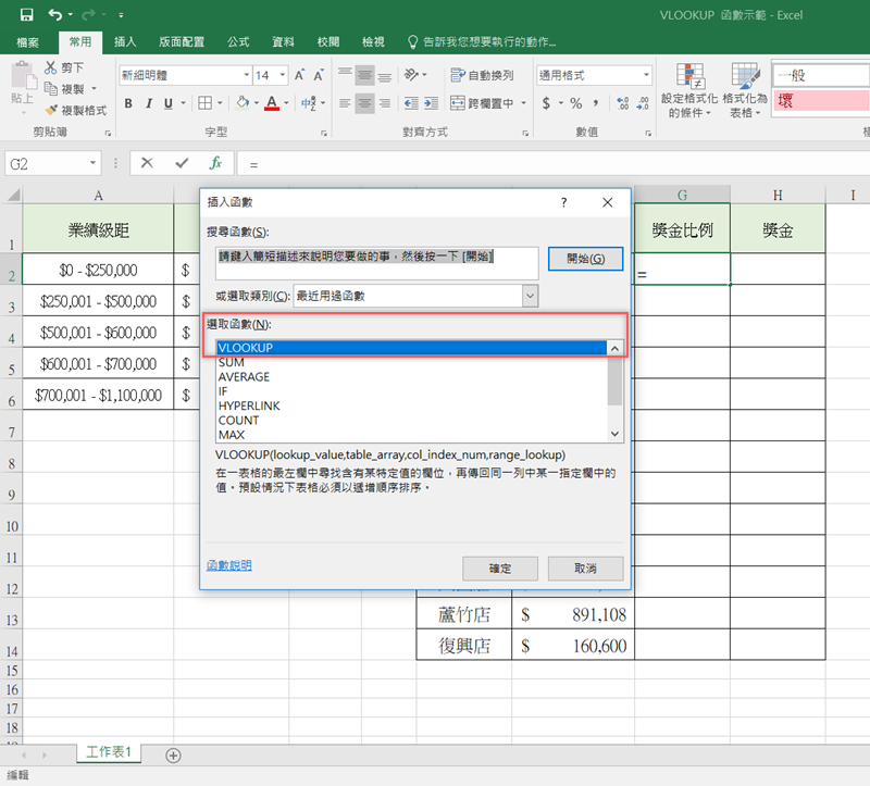 在獎金比例的第一格插入函數「VLOOKUP」,如果沒用過通常不會在下面列表,要搜尋一下。