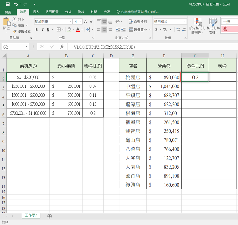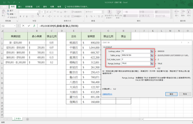 - 「Lookup_value」代表要用來計算的資料,這裡是店營業額「F2」這欄。