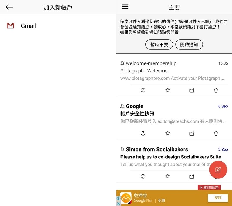開啟後先建立帳戶,登入頁面就是 Gmail 收件夾,上方提示你可以打開通知,收件人已讀就會傳訊給你。